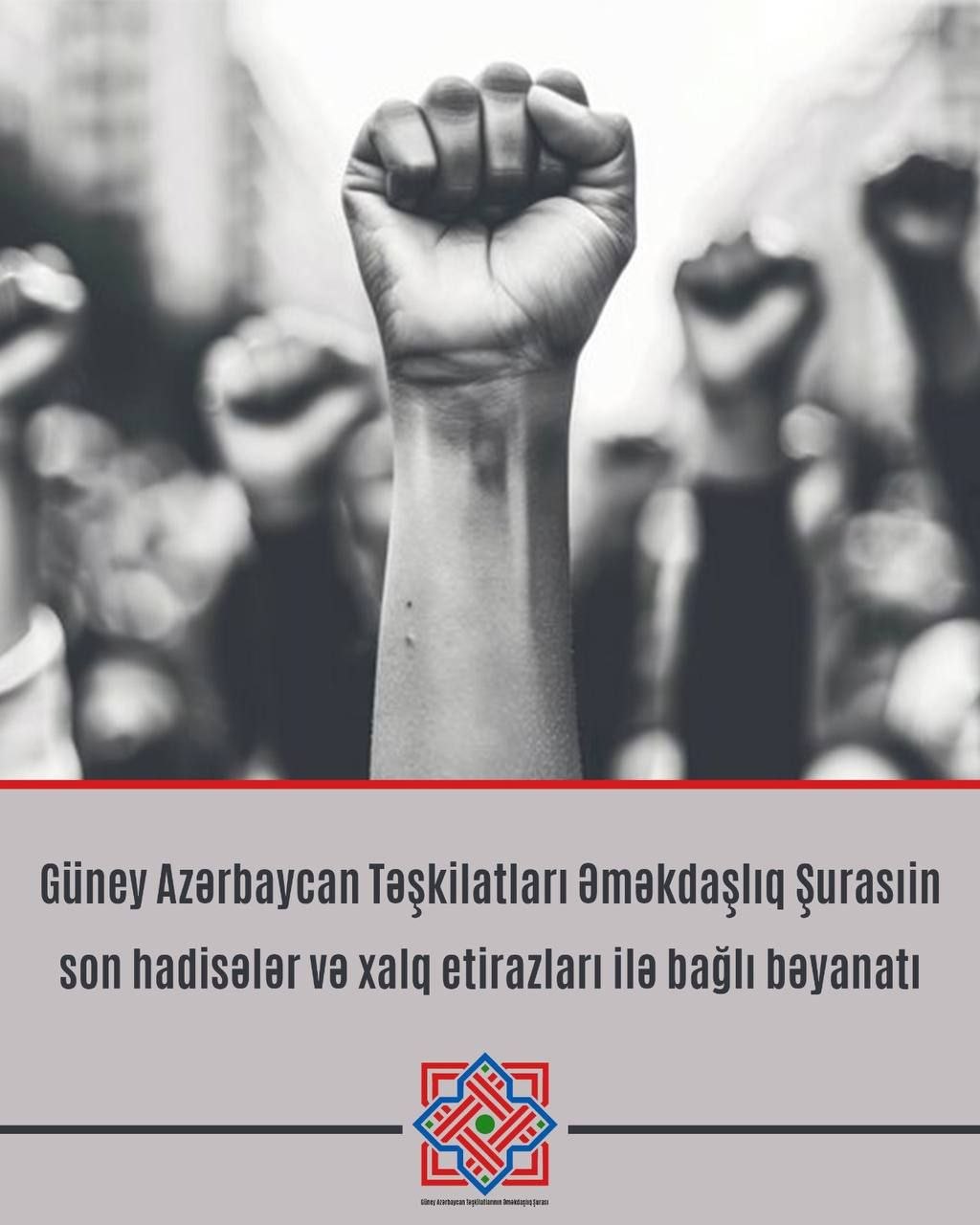 شورای همکاری سازمانهای آزربایجان جنوبی، در چنین روزی که مصادف با 31 دسامبر، روز همبستگی آزربایجانیهای جهان به عنوان روزی سمبلیک برای همبستگی و اتحاد ملتمان می باشد، ضمن تأکید بر حقانیت مطالبات برحق و انسانی مردم، با اعلام همبستگی با مردم معترض از حق مشروع مردم برای اعتراضات مدنی حمایت میکند و در عین حال مطمئن است که جوانان و ملت تورک اجازه نخواهند داد این اعتراضات به نفع جریانهای فاشیستی، استعمارطلب و ارتجاعی مصادره یا منحرف شود.