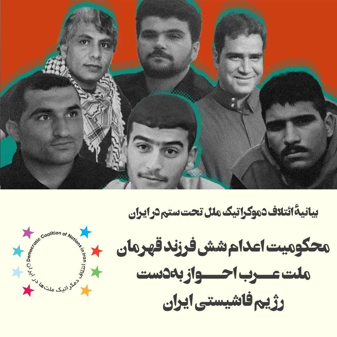 ائتلاف دموکراتیک ملل تحت ستم در ایران با خشم انقلابی و اندوه عمیق، اعدام شش تن از فرزندان دلیر ملت عرب احواز را در زندان سپیدار اهواز که بامداد روز شنبه ۱۲ مهر ۱۴۰۴ به‌دست دژخیمان رژیم ولایت فقیه صورت گرفت، قویاً محکوم می‌کند.